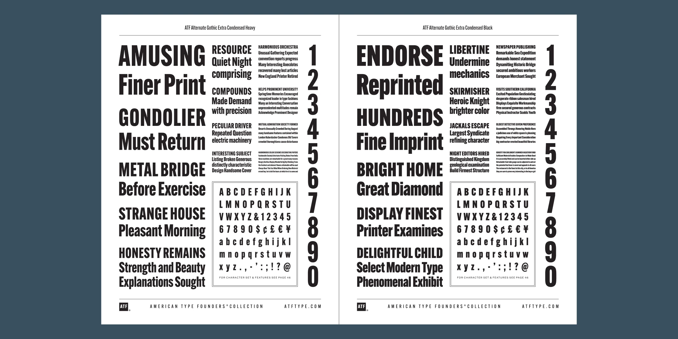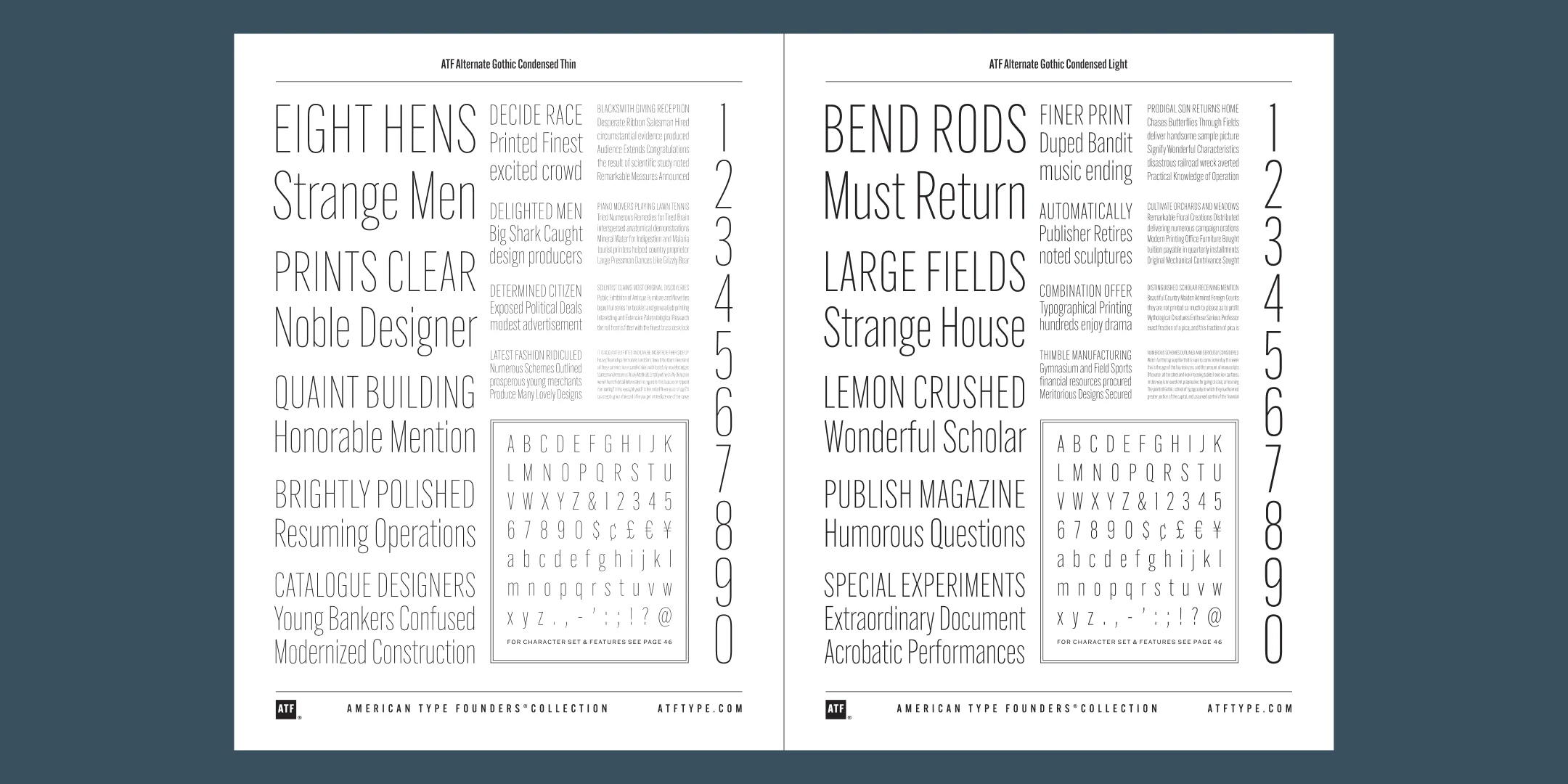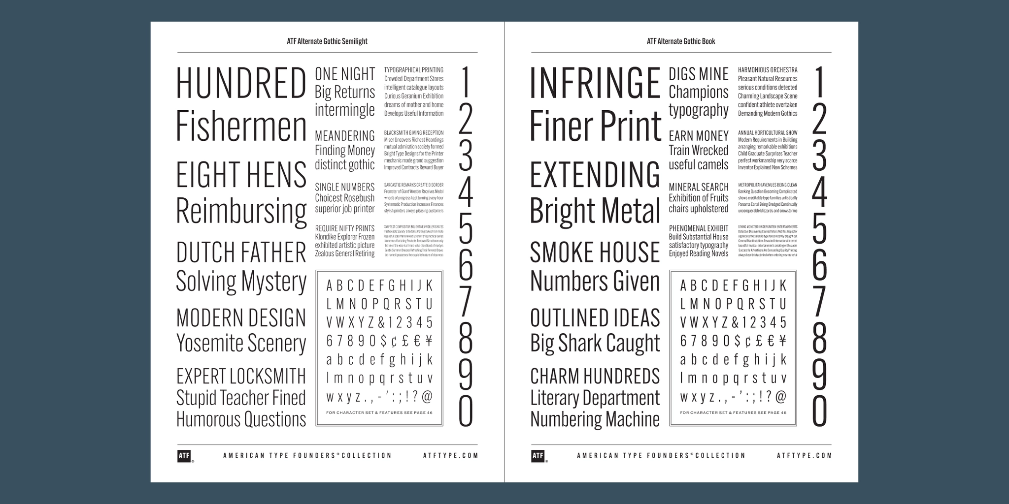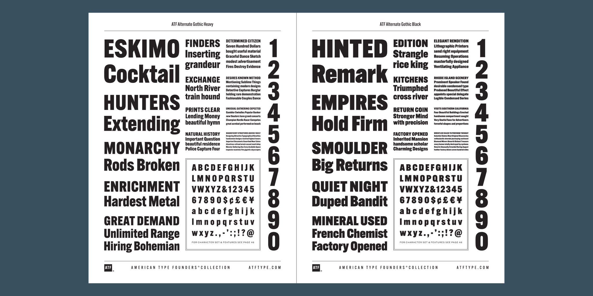 ATF Alternate Gothic has impact at any size. Its letterforms are instantly familiar: Benton’s original metal type family was used throughout the 20th century in newspapers, magazines, and advertising, providing “strong and effective display” in a compact space. Monotype issued its own version for machine typesetting, and Alternate Gothic likely served as inspiration for Linotype’s Trade Gothic® Bold and Bold Condensed. ATF Alternate Gothic expands on the characteristics that perhaps made Trade Gothic so popular, providing a wider range of weights and widths to address the needs of today’s designers and technologies.