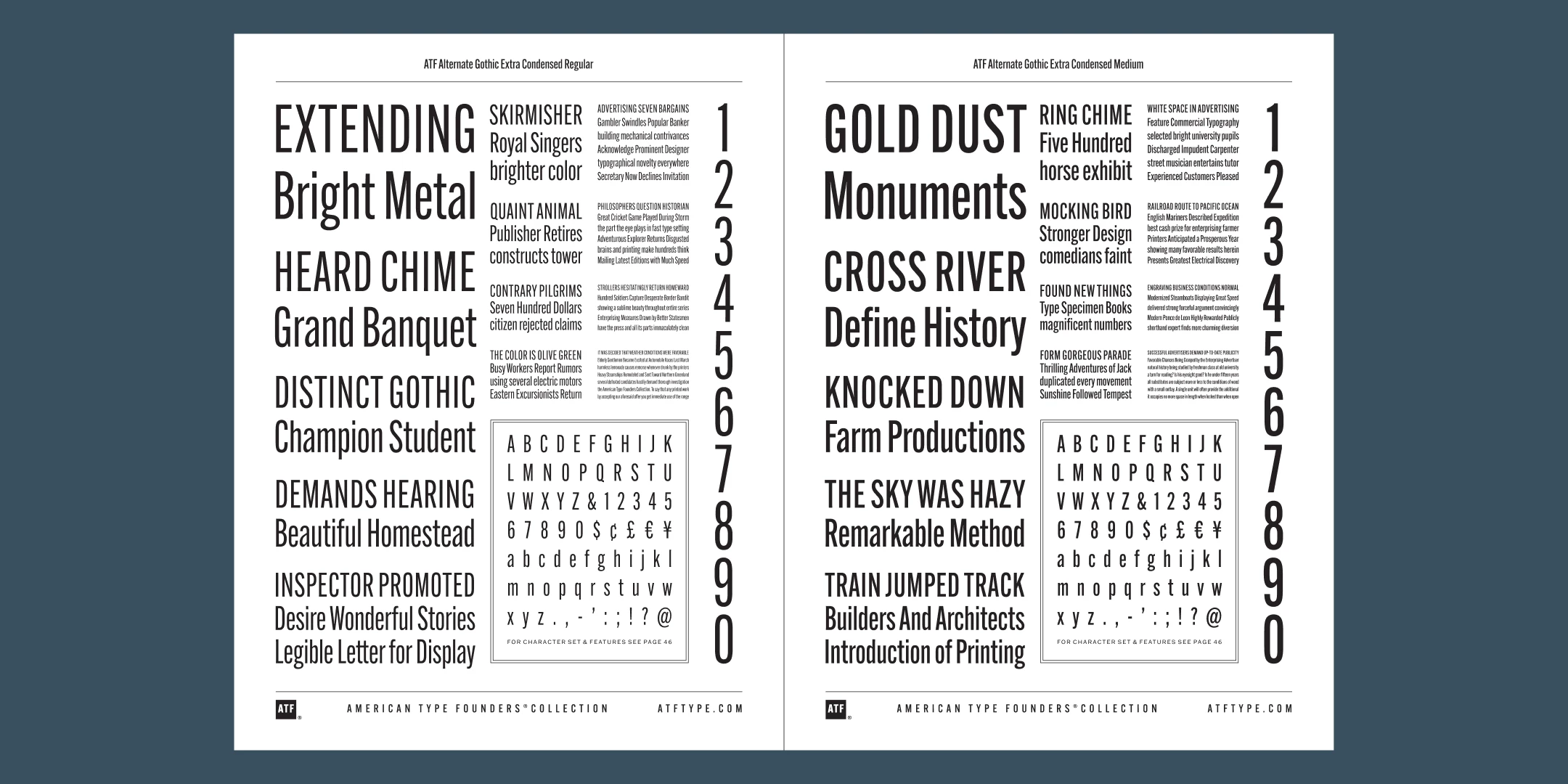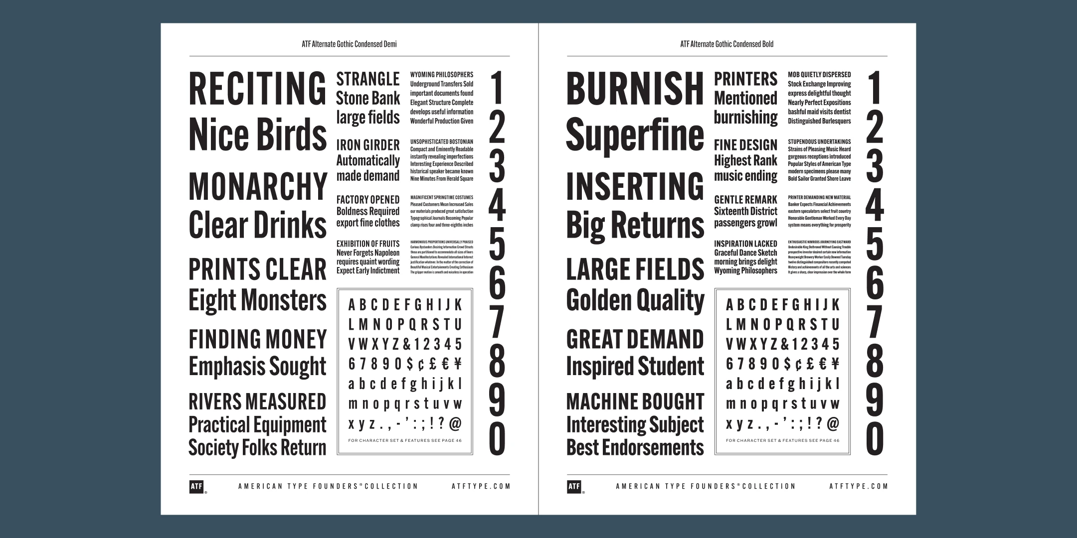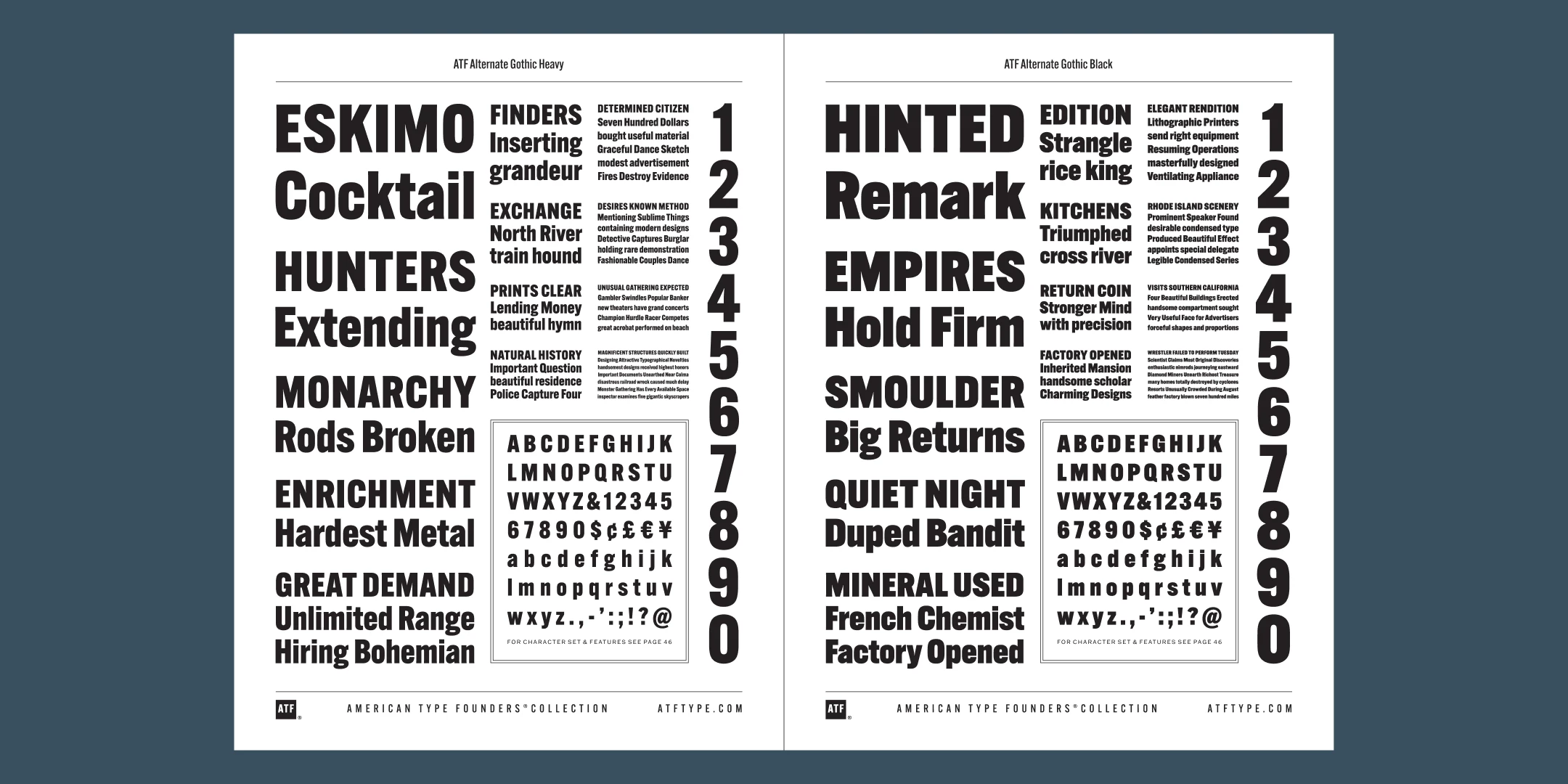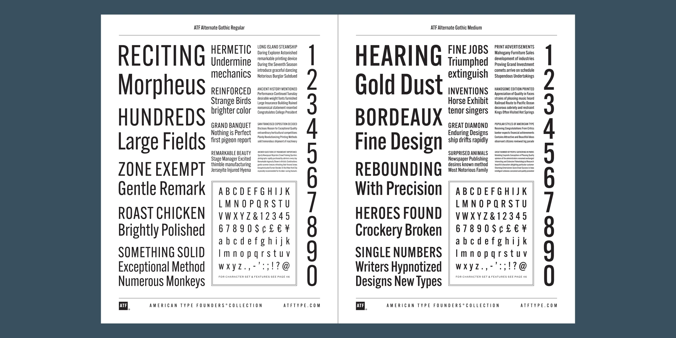 ATF Alternate Gothic has impact at any size. Its letterforms are instantly familiar: Benton’s original metal type family was used throughout the 20th century in newspapers, magazines, and advertising, providing “strong and effective display” in a compact space. Monotype issued its own version for machine typesetting, and Alternate Gothic likely served as inspiration for Linotype’s Trade Gothic® Bold and Bold Condensed. ATF Alternate Gothic expands on the characteristics that perhaps made Trade Gothic so popular, providing a wider range of weights and widths to address the needs of today’s designers and technologies.