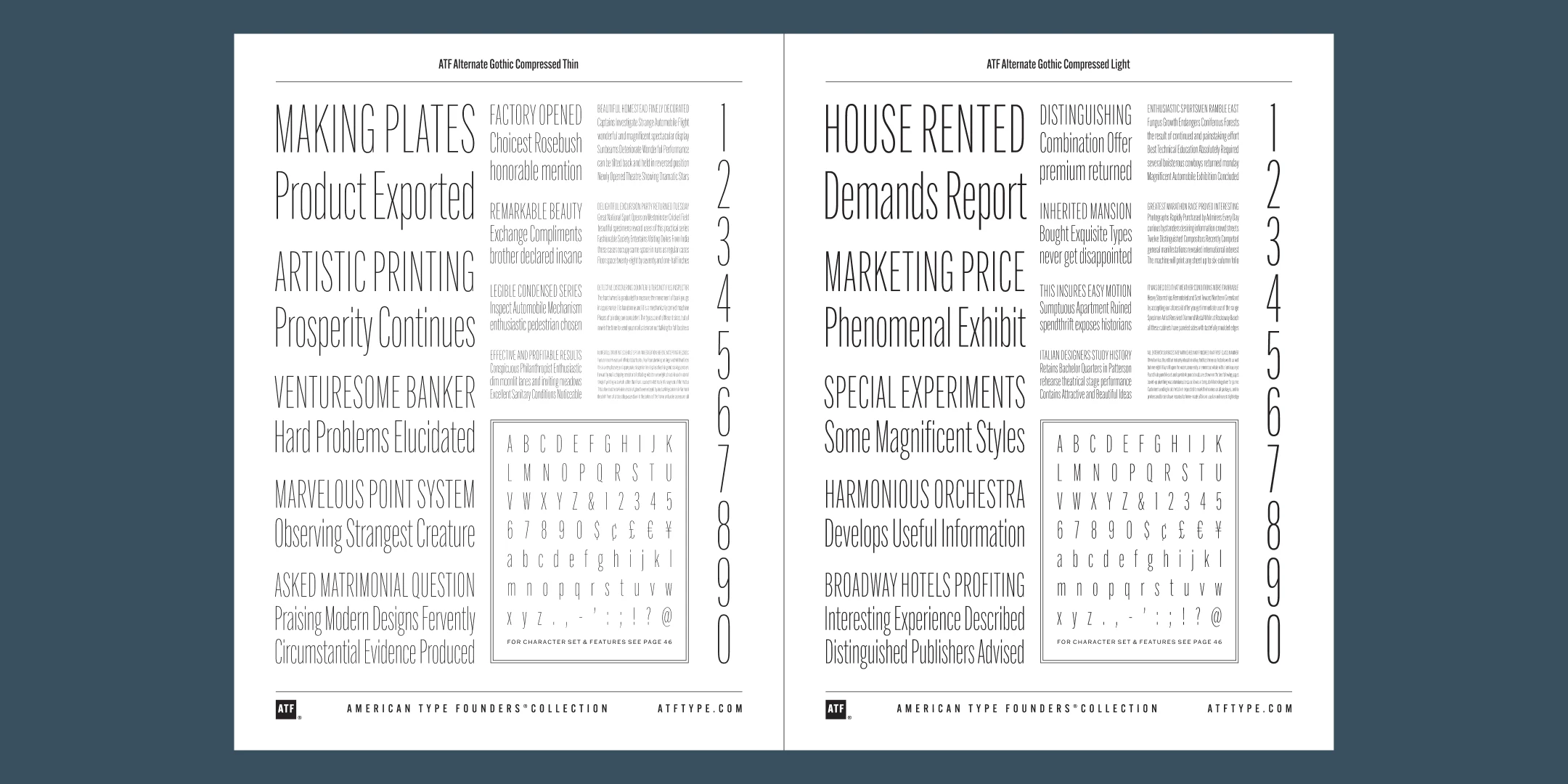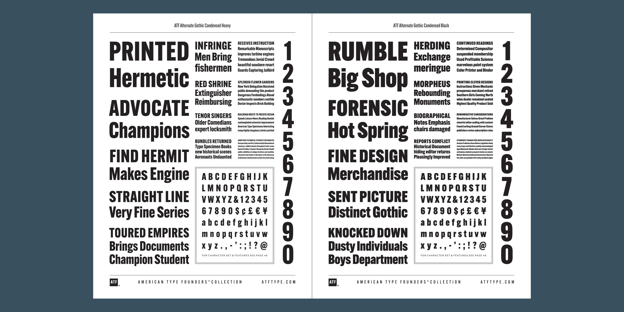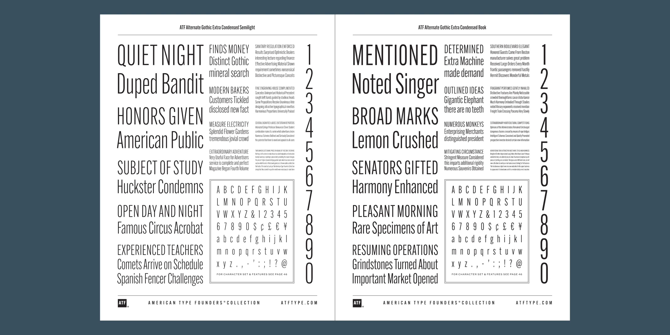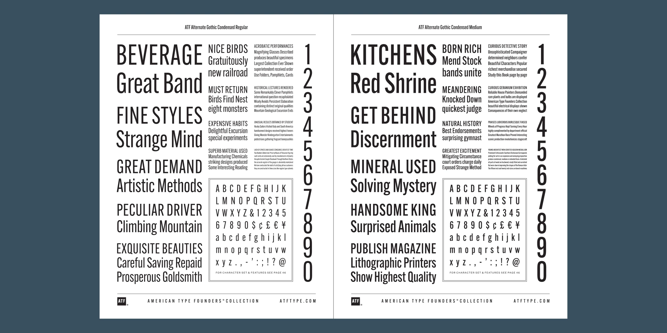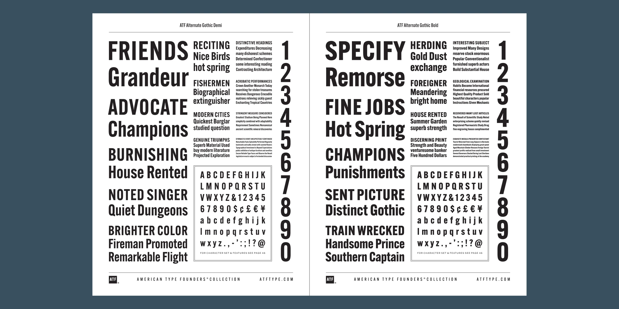 ATF Alternate Gothic has impact at any size. Its letterforms are instantly familiar: Benton’s original metal type family was used throughout the 20th century in newspapers, magazines, and advertising, providing “strong and effective display” in a compact space. Monotype issued its own version for machine typesetting, and Alternate Gothic likely served as inspiration for Linotype’s Trade Gothic® Bold and Bold Condensed. ATF Alternate Gothic expands on the characteristics that perhaps made Trade Gothic so popular, providing a wider range of weights and widths to address the needs of today’s designers and technologies.