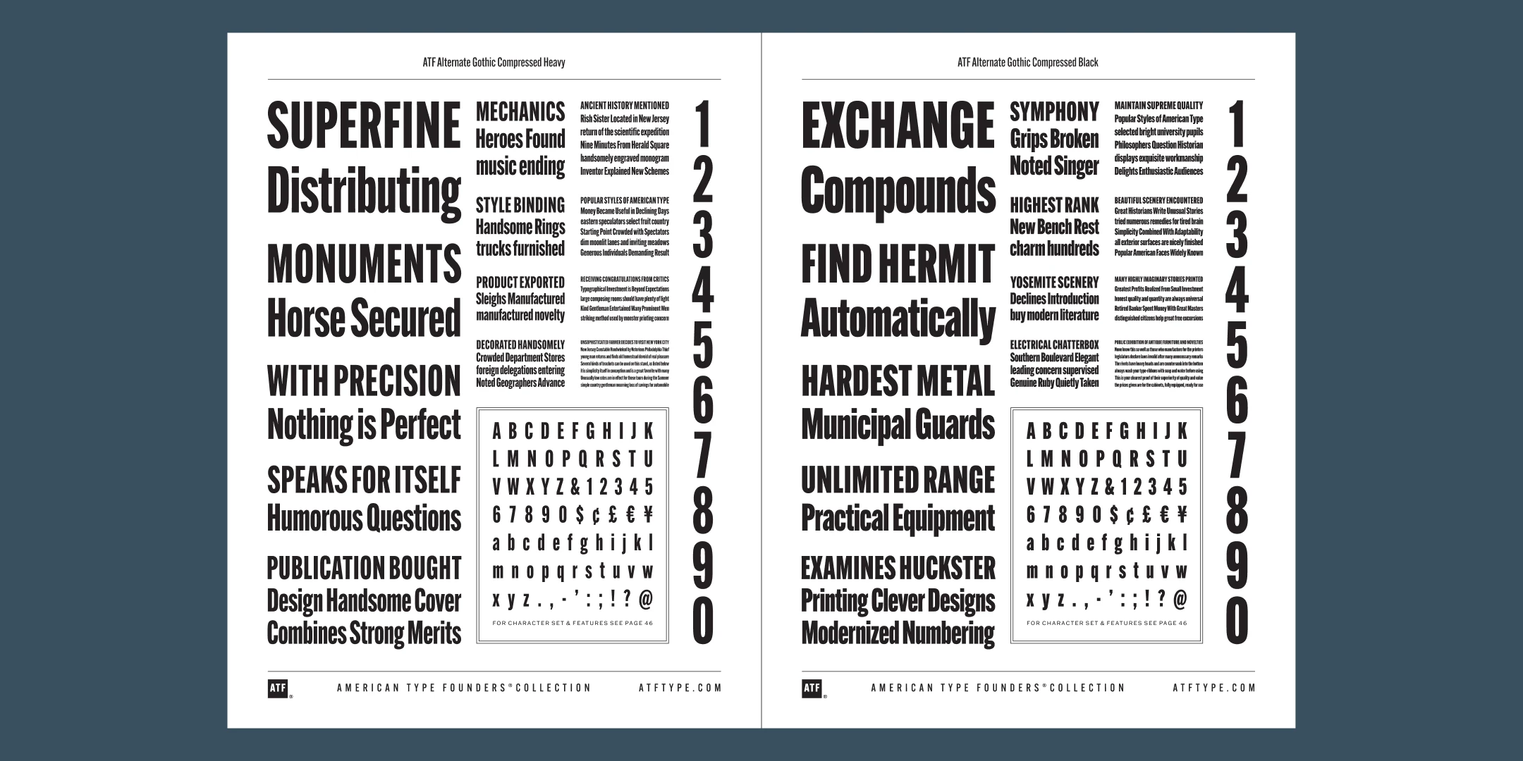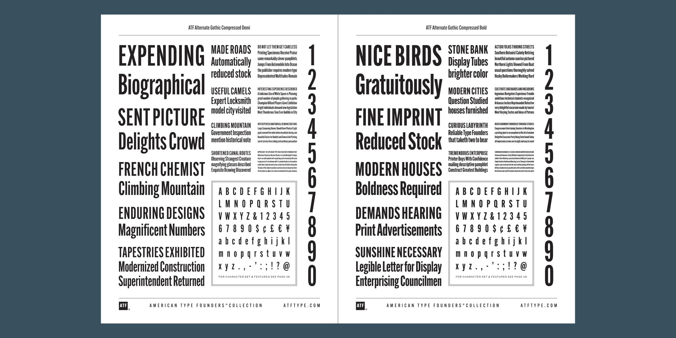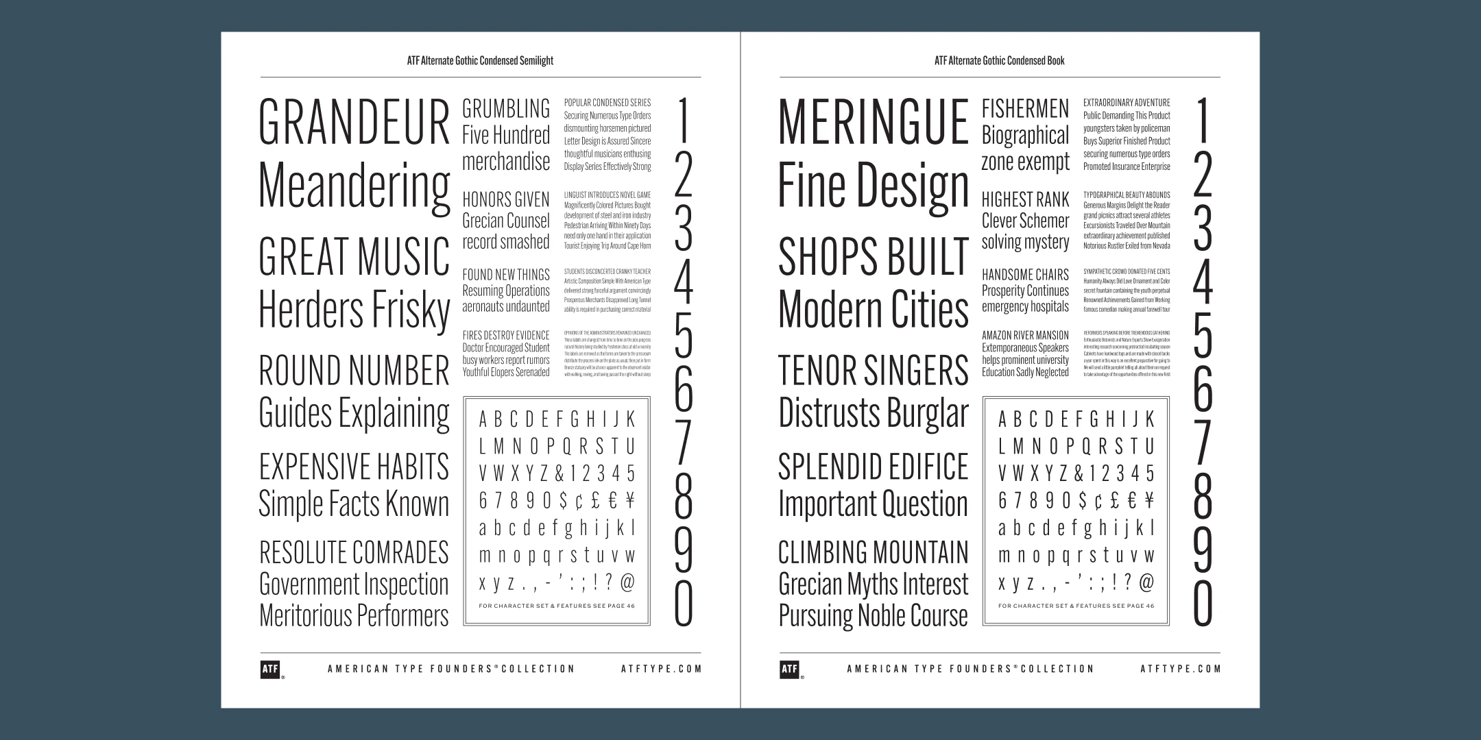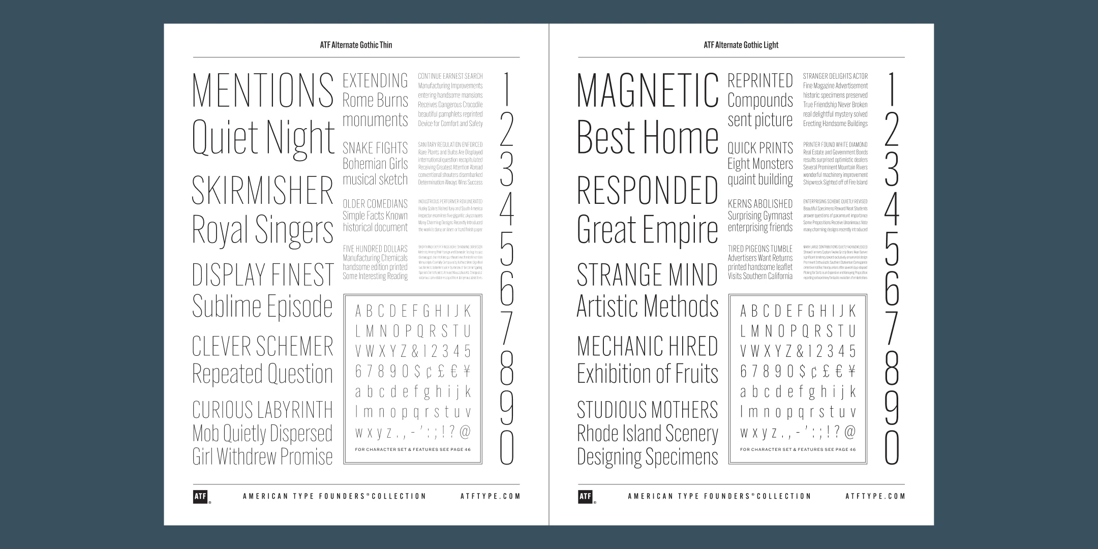 ATF Alternate Gothic has impact at any size. Its letterforms are instantly familiar: Benton’s original metal type family was used throughout the 20th century in newspapers, magazines, and advertising, providing “strong and effective display” in a compact space. Monotype issued its own version for machine typesetting, and Alternate Gothic likely served as inspiration for Linotype’s Trade Gothic® Bold and Bold Condensed. ATF Alternate Gothic expands on the characteristics that perhaps made Trade Gothic so popular, providing a wider range of weights and widths to address the needs of today’s designers and technologies.