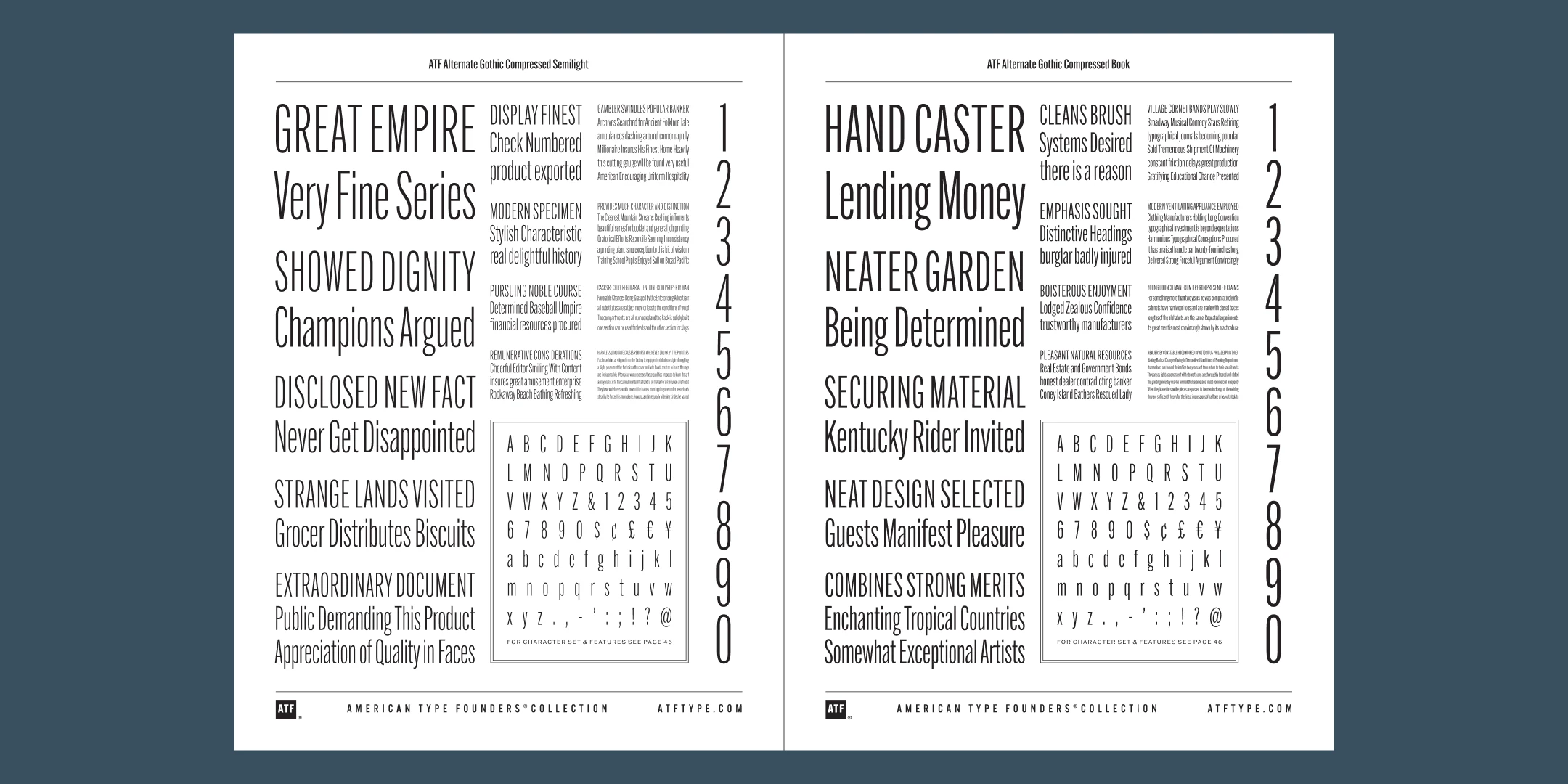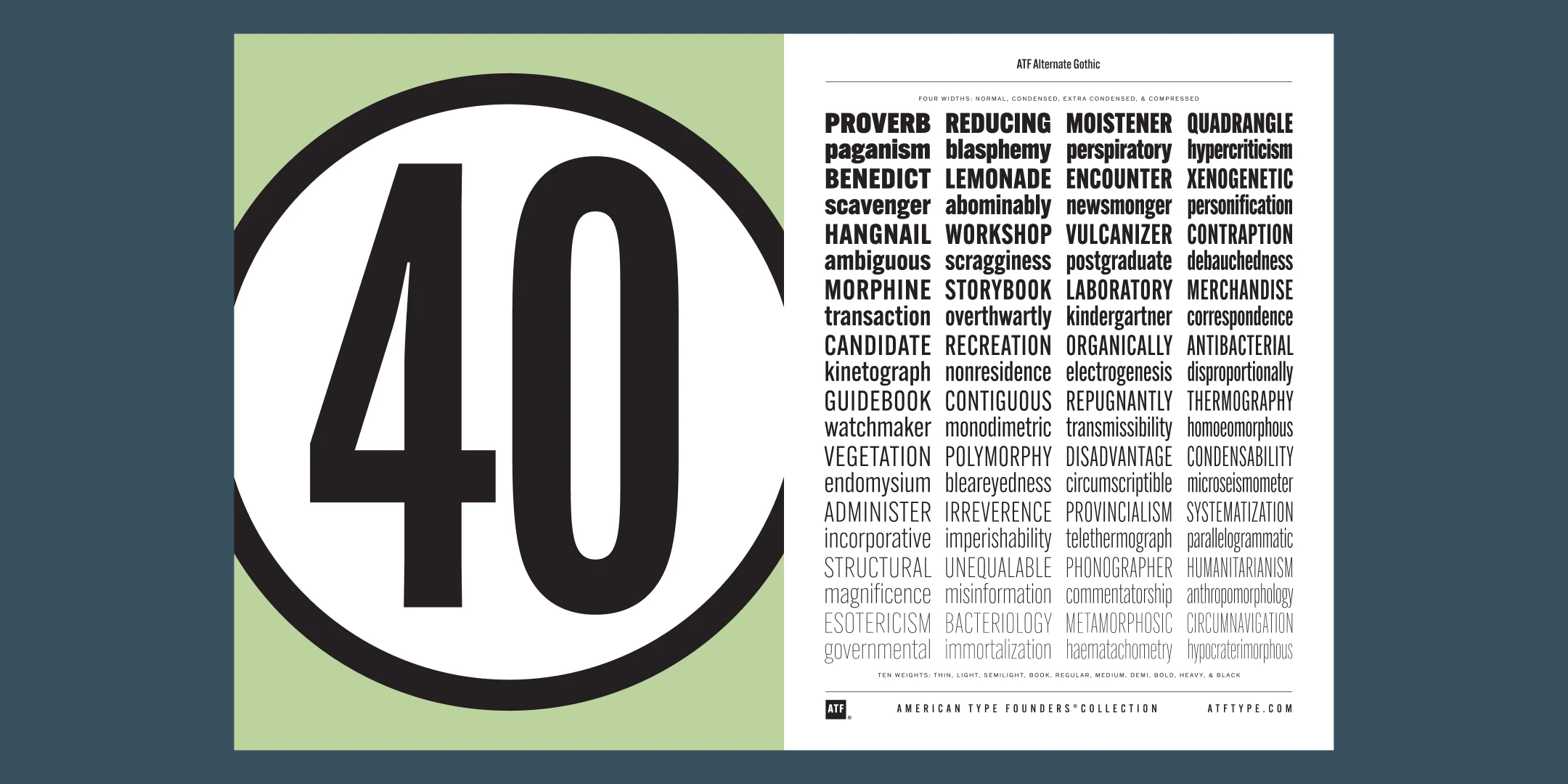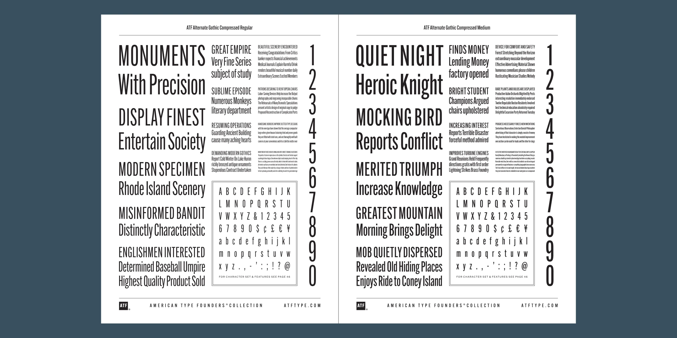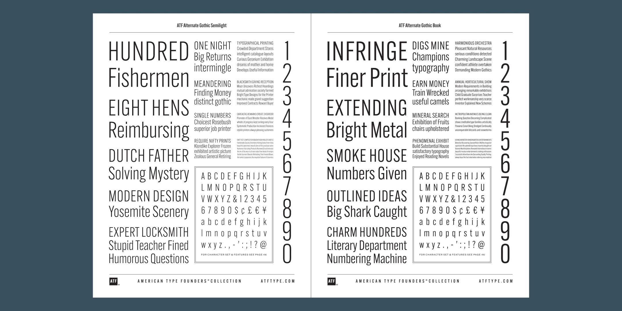 ATF Alternate Gothic has impact at any size. Its letterforms are instantly familiar: Benton’s original metal type family was used throughout the 20th century in newspapers, magazines, and advertising, providing “strong and effective display” in a compact space. Monotype issued its own version for machine typesetting, and Alternate Gothic likely served as inspiration for Linotype’s Trade Gothic® Bold and Bold Condensed. ATF Alternate Gothic expands on the characteristics that perhaps made Trade Gothic so popular, providing a wider range of weights and widths to address the needs of today’s designers and technologies.