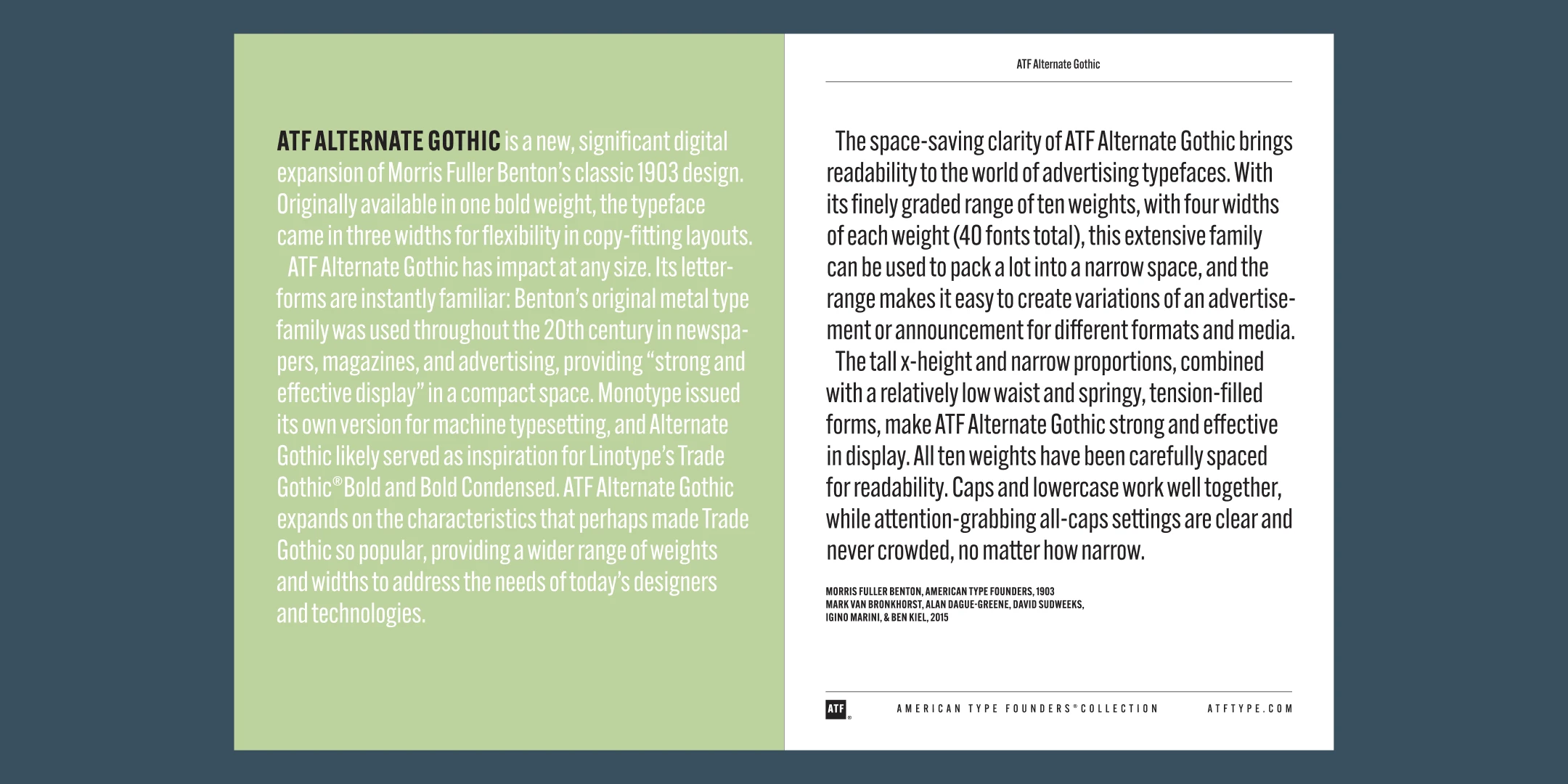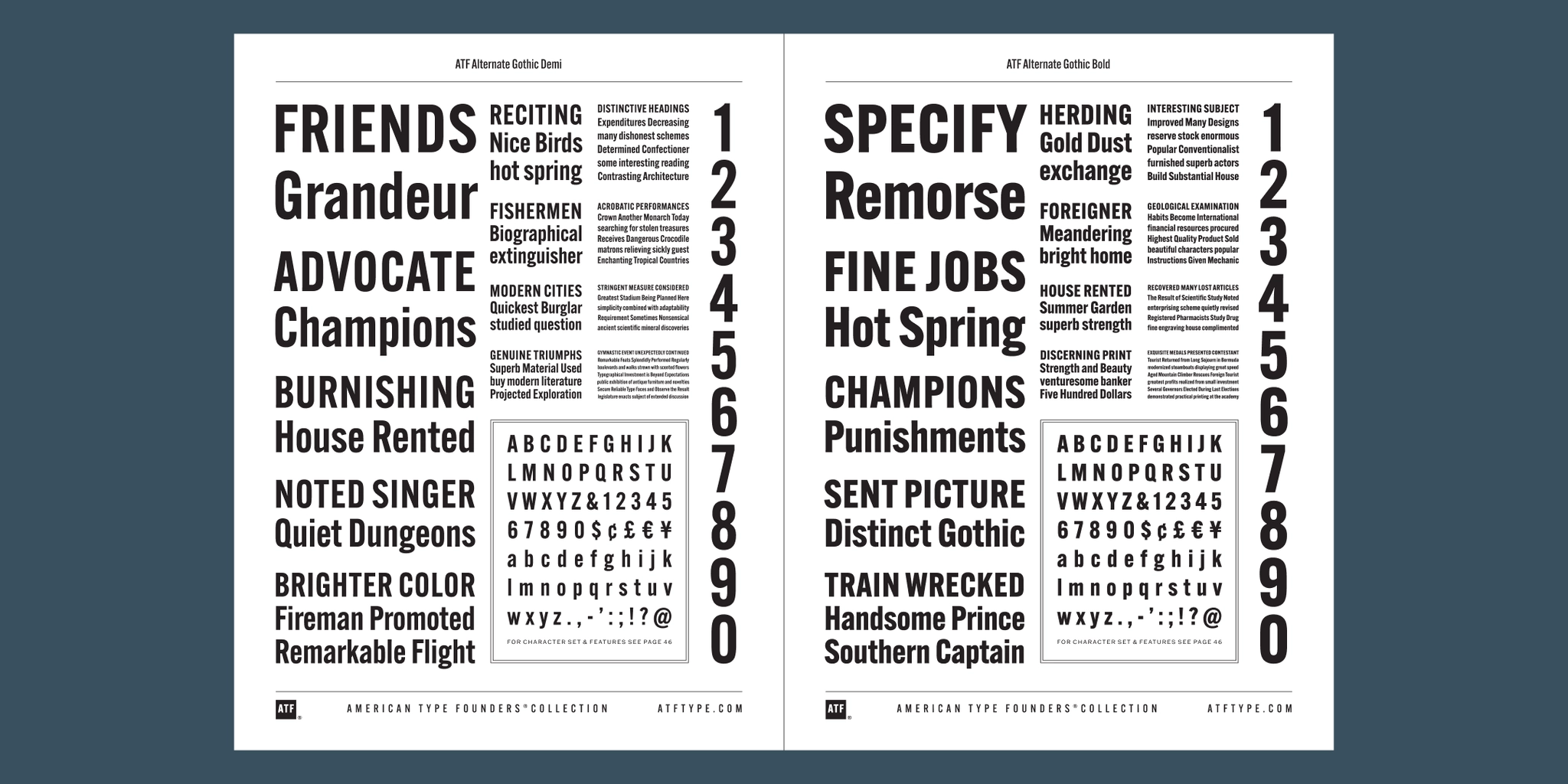 ATF Alternate Gothic is a new, significant digital expansion of Morris Fuller Benton’s classic 1903 design. Originally available in one bold weight, the typeface came in three widths for flexibility in copy-fitting layouts.