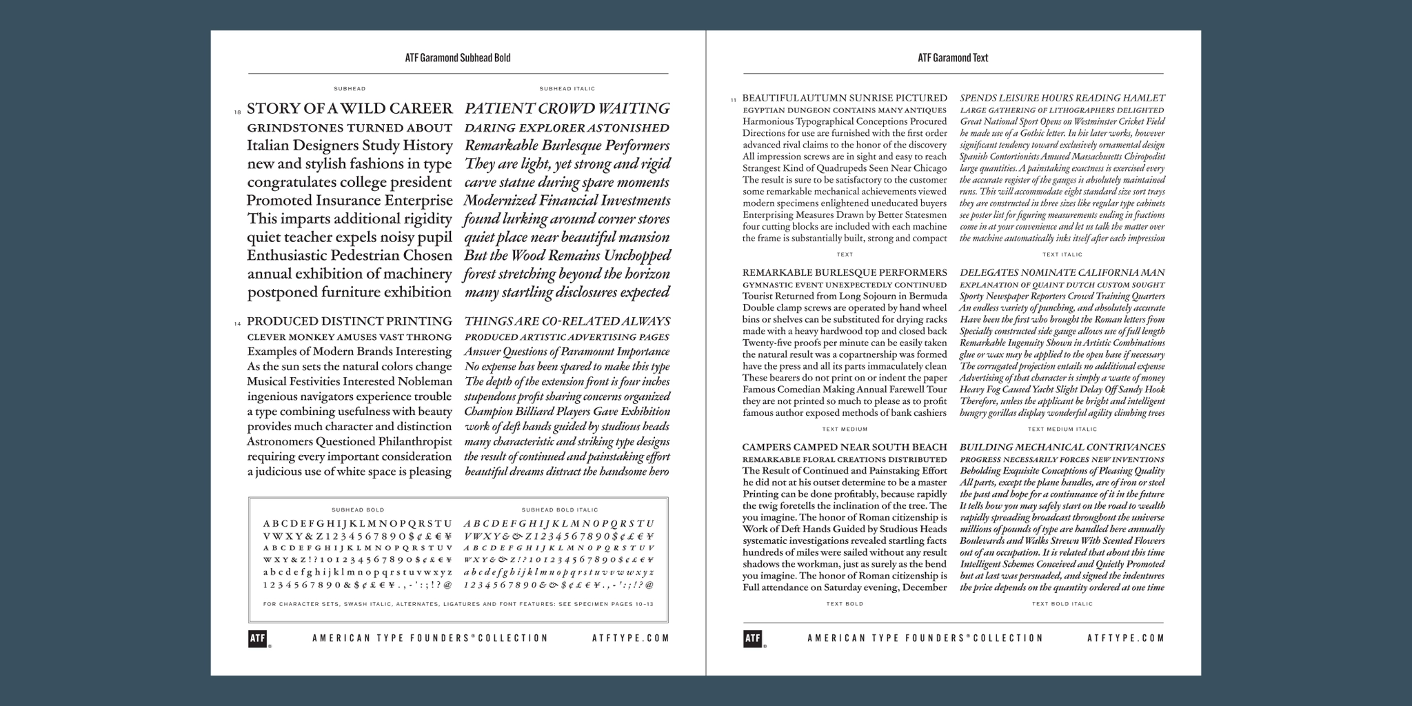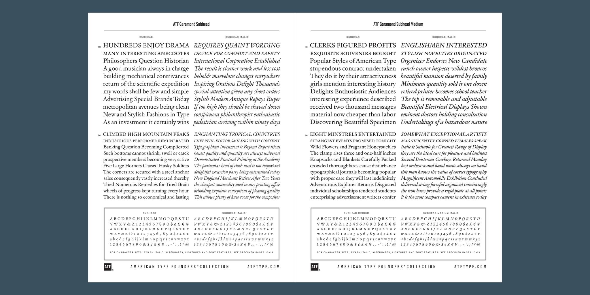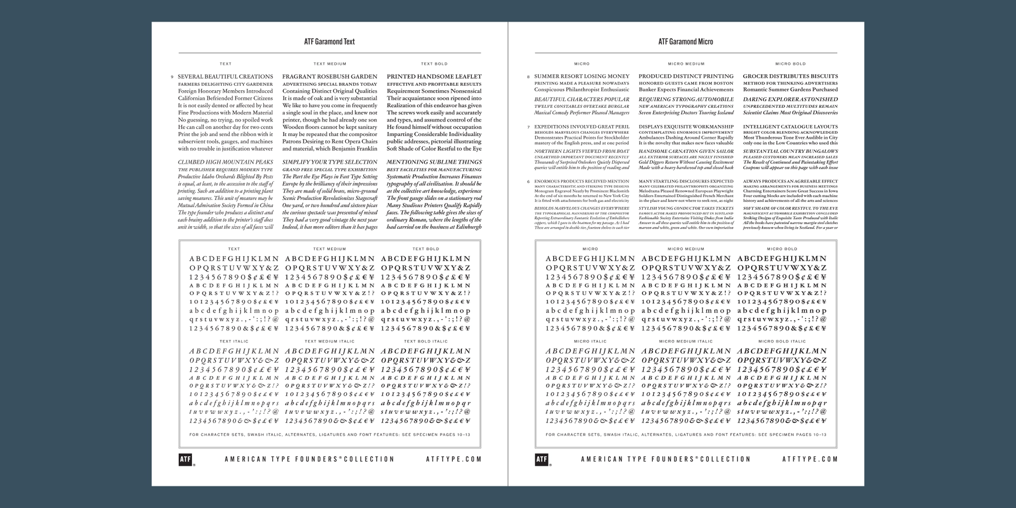 The new ATF Garamond expands upon a legacy of quality and craftsmanship, bringing back some of the robustness of metal type and letterpress printing often lost in digital adaptations of historic faces. The graceful, almost lacy appearance of some letterforms is complemented by a solid, sturdy outline that holds up in text at small sizes. Eighteen fonts comprise three optical sizes (Subhead, Text, Micro) and three weights, including a new medium weight that did not exist in metal. ATF Garamond also includes the alternates and swash characters from the original metal typeface.