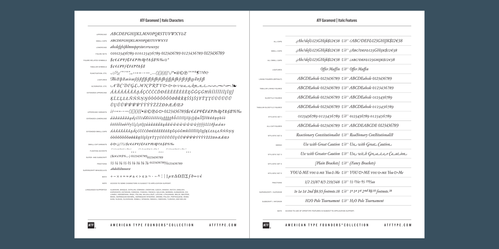 The character of ATF Garamond is lively, reflecting the spirit of the French Renaissance as interpreted in the early twentieth century. Its roman has more verve than later oldstyle faces like Caslon, and its italic is sprightly, yet remarkably readable.