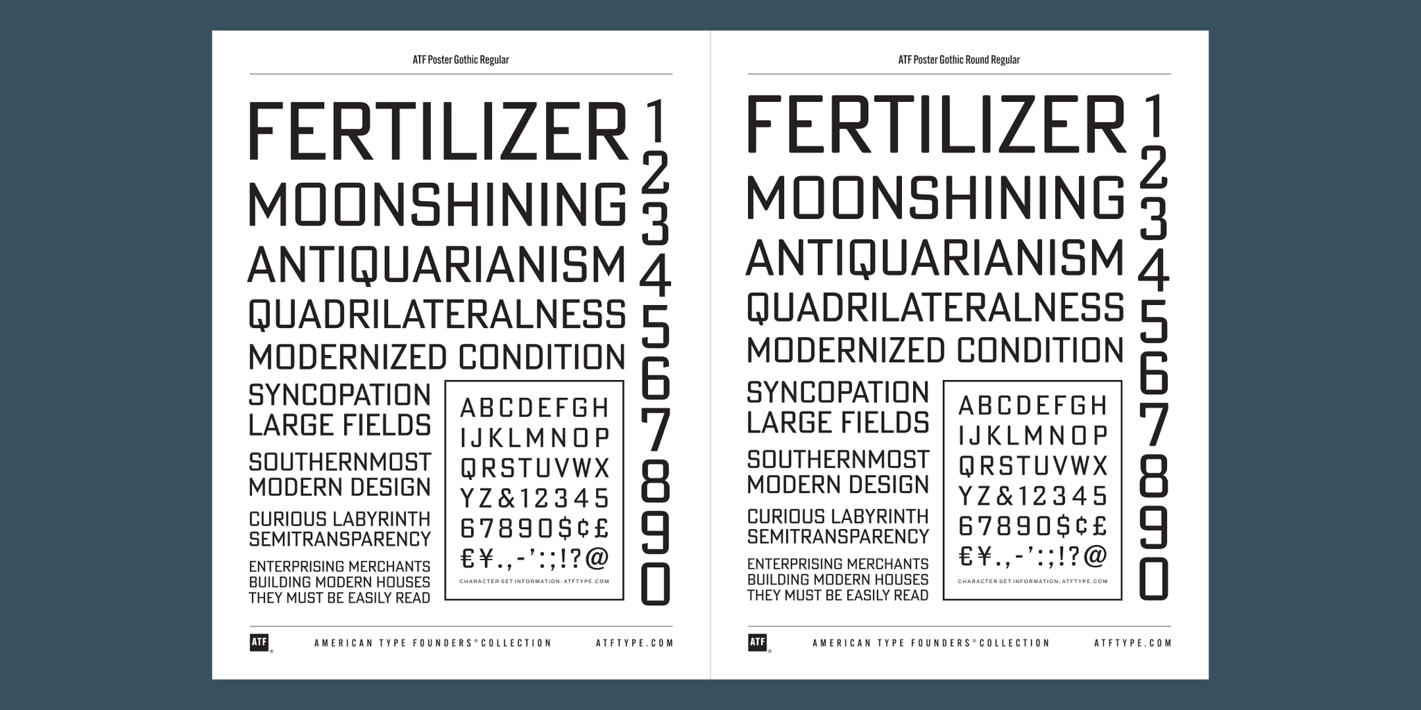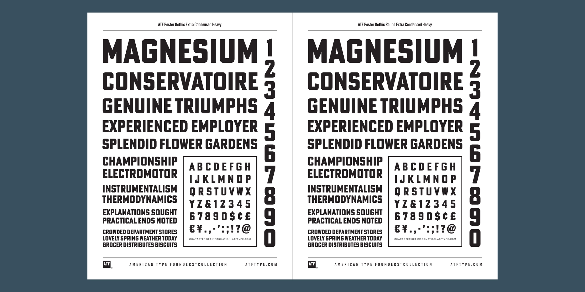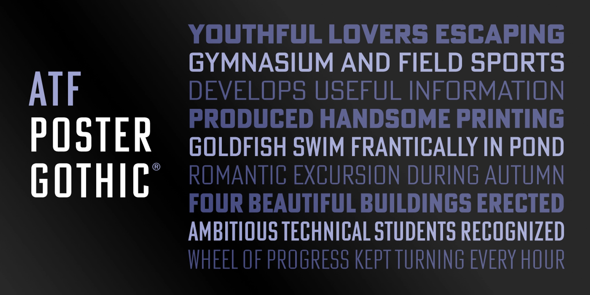 Certain weights also recall the style of lettering used on athletic team jerseys, television crime dramas, action & adventure movie titles, and engraved stationery. With three widths and five weights, ATF Poster Gothic is both distinctive and versatile. The complete family is also available in a “Round” version, with corners subtly rounded for a softer, more “printed” feel.