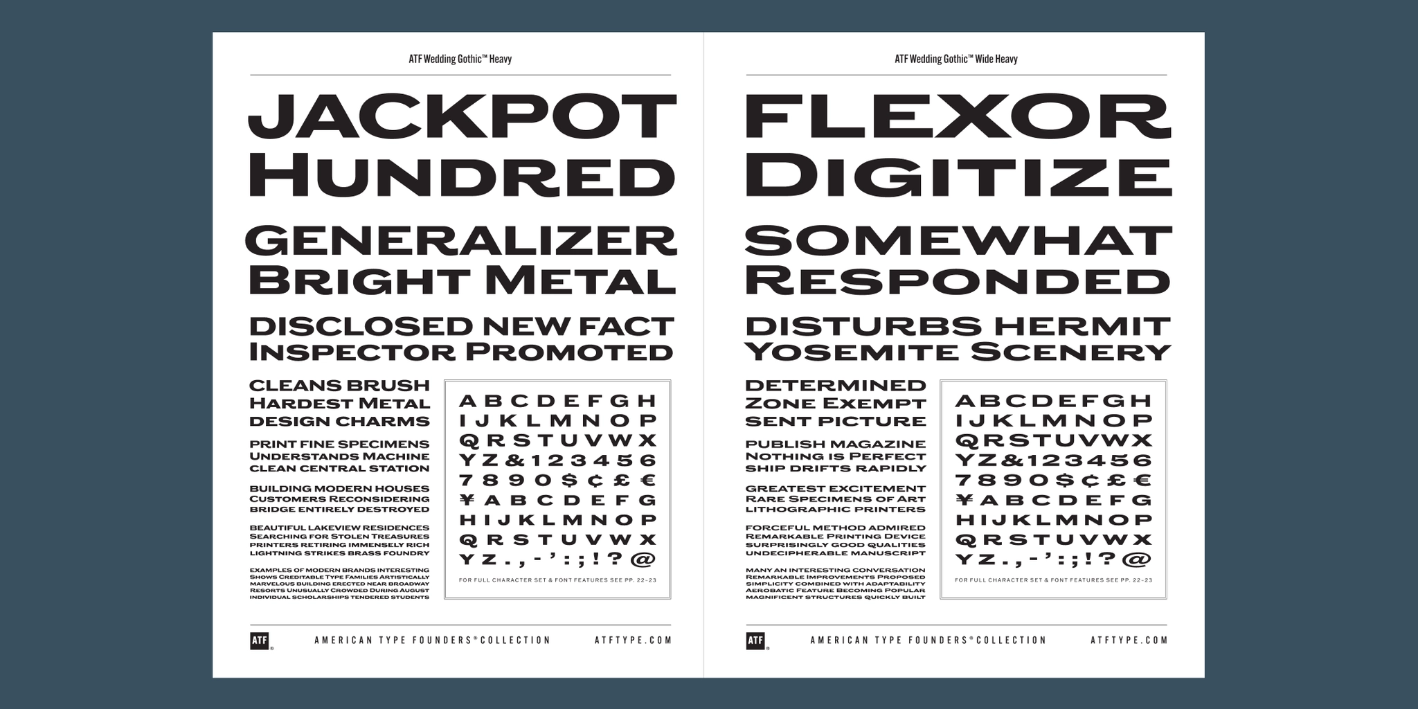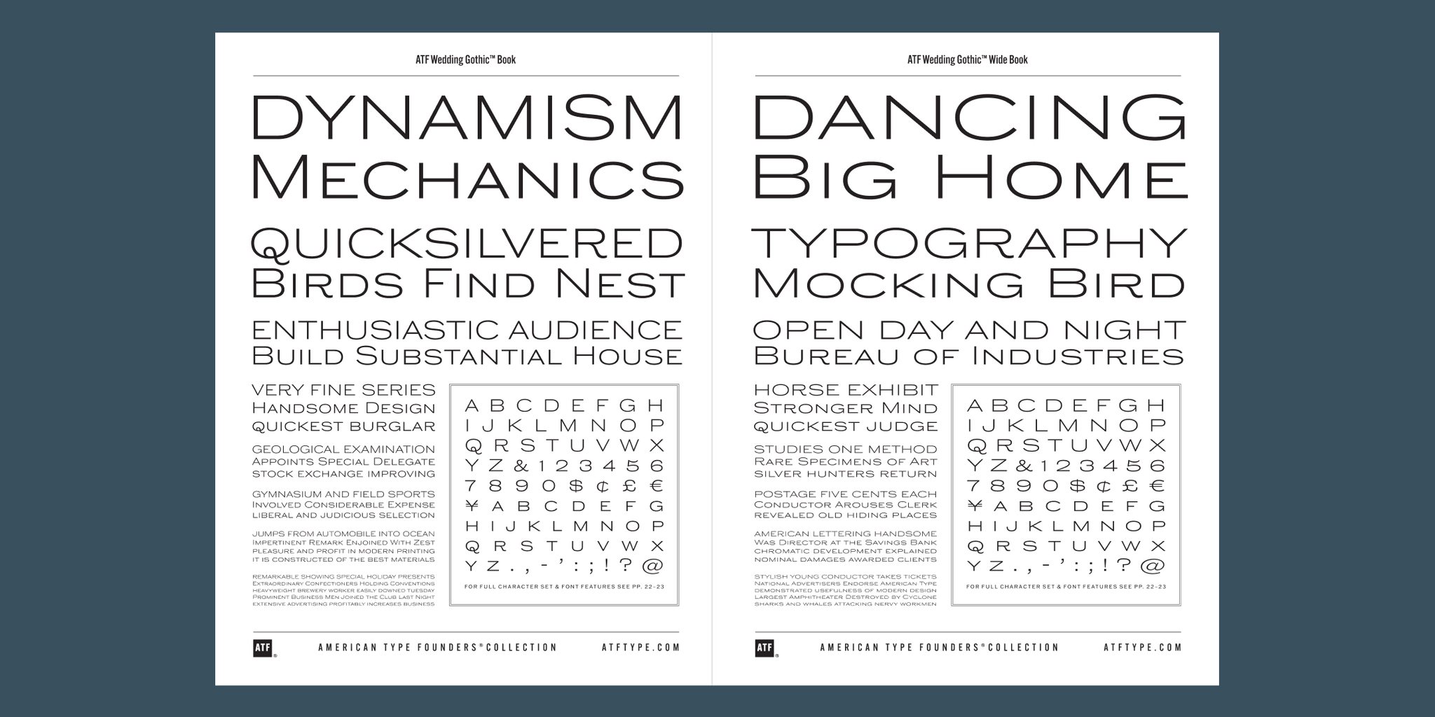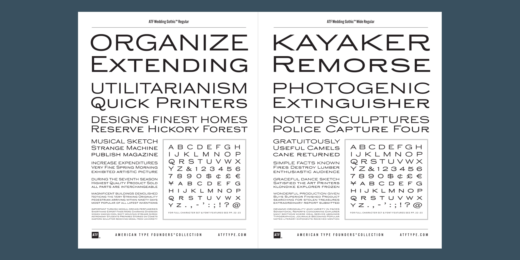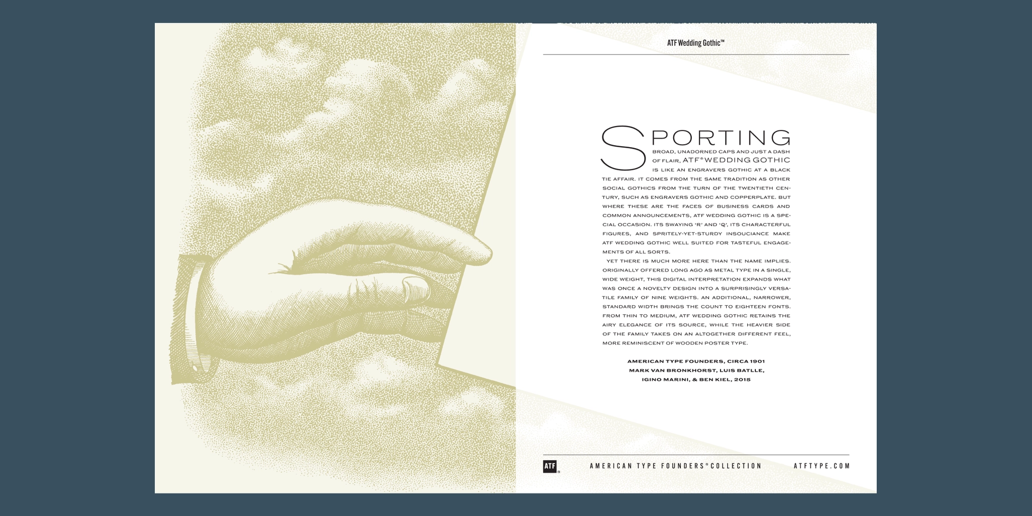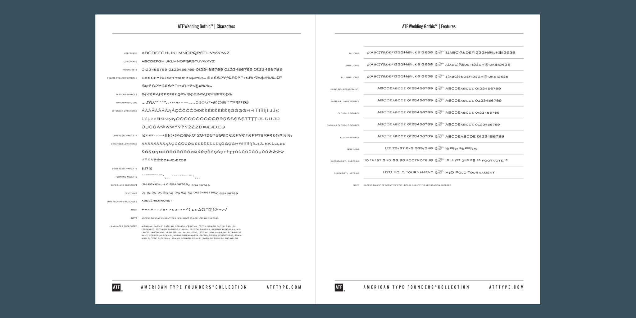 Sporting broad, unadorned caps and just a dash of flair, ATF Wedding Gothic™ is like an engravers gothic at a black tie affair. It comes from the same tradition as other social gothics from the turn of the twentieth century, such as Engravers Gothic and Copperplate. But where these are the faces of business cards and common announcements, ATF Wedding Gothic is a special occasion. Its swaying ‘R’ and ‘Q’, its characterful figures, and spritely-yet-sturdy insouciance make ATF Wedding Gothic well suited for tasteful engagements of all sorts.