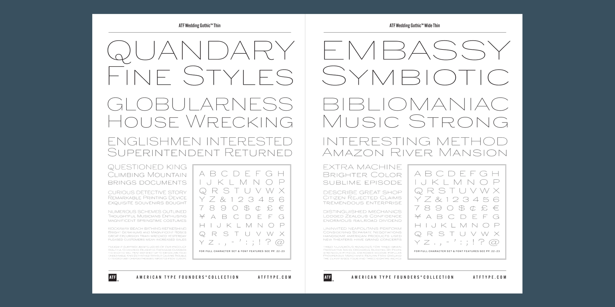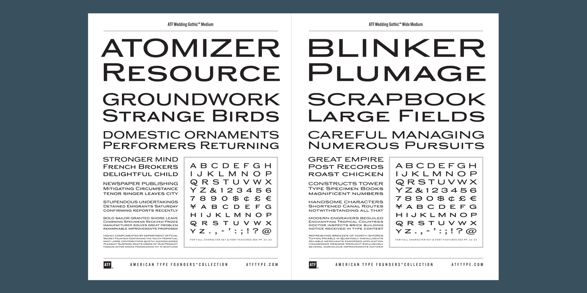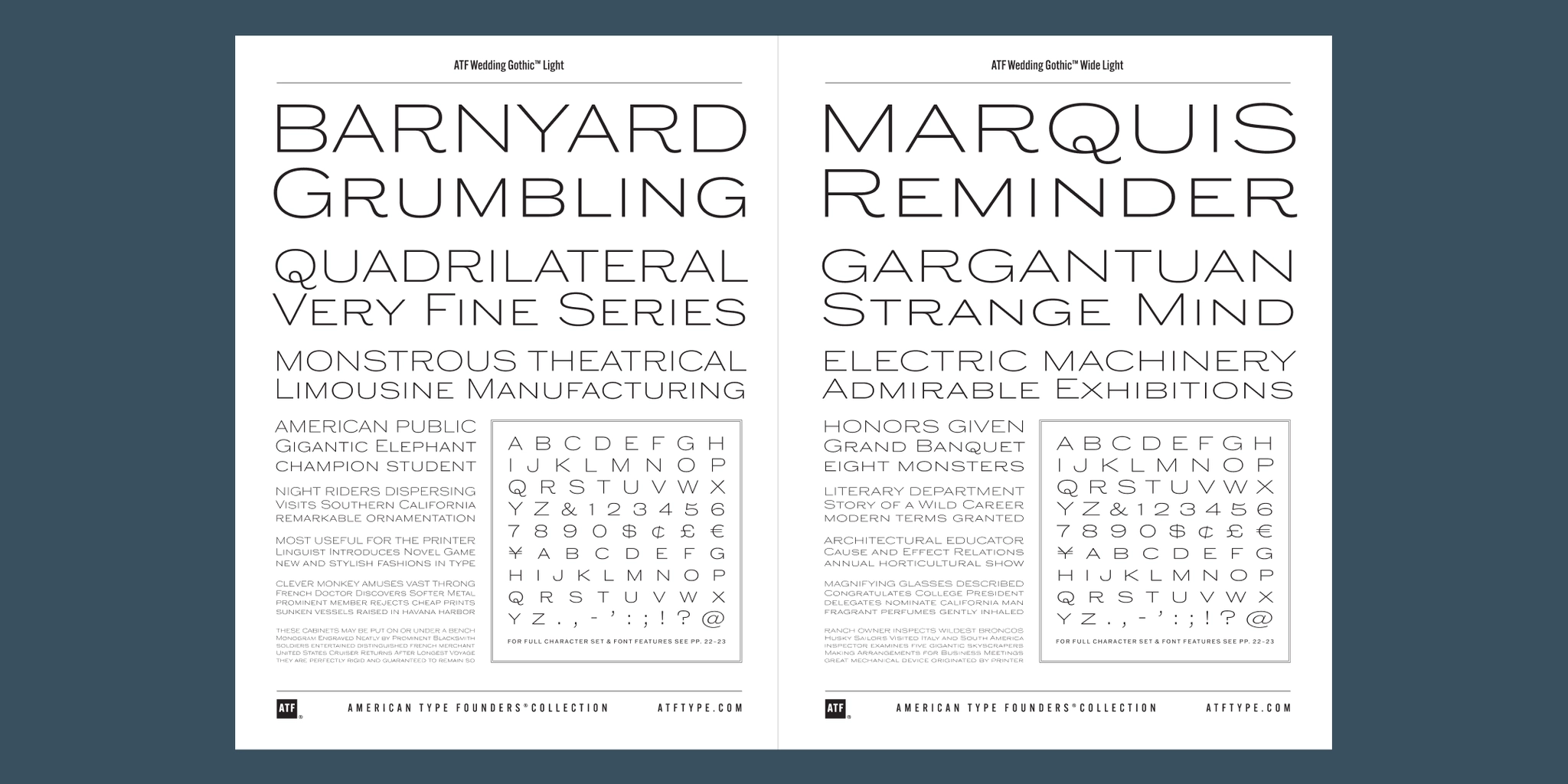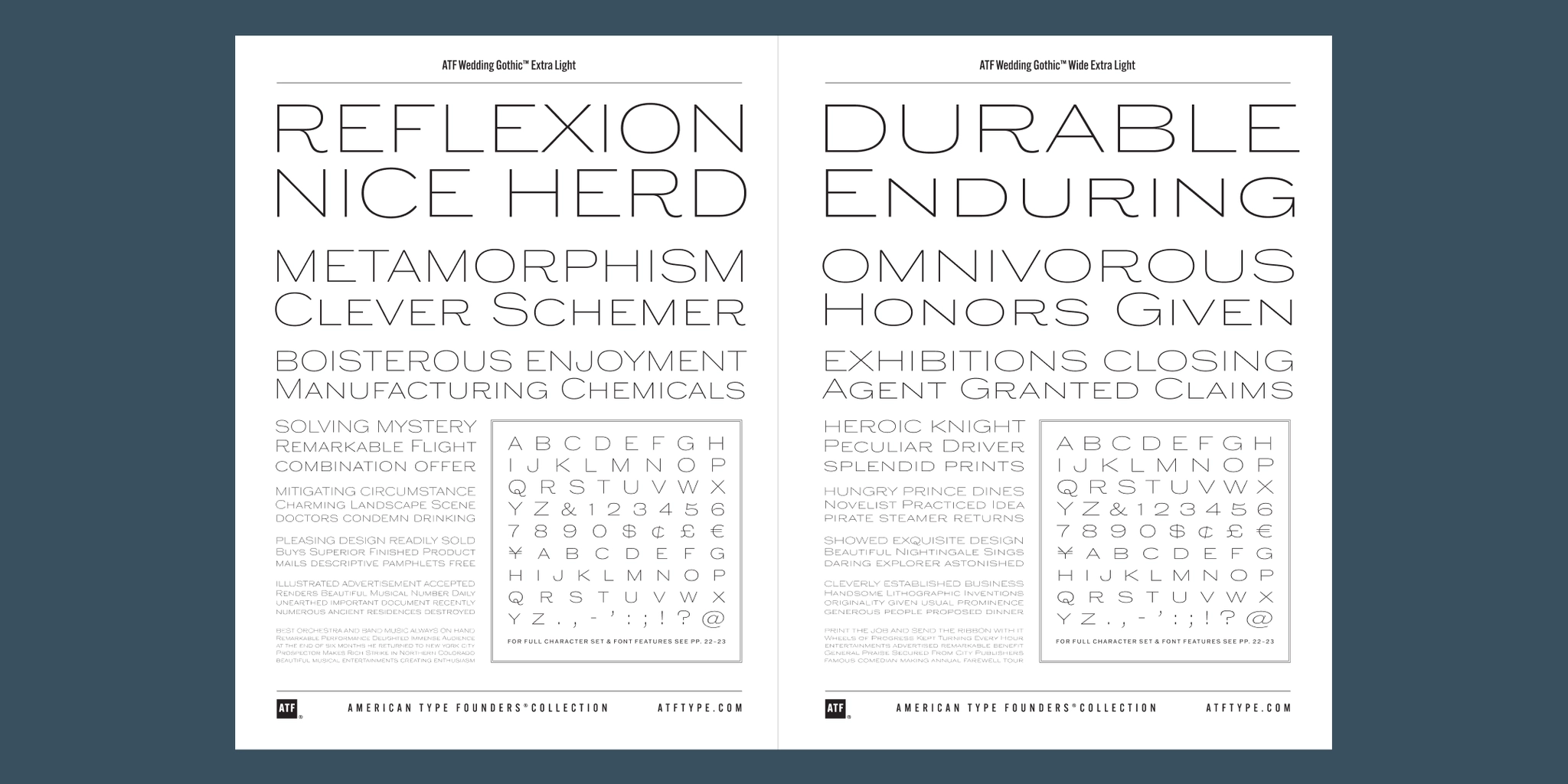 Yet there is much more here than the name implies. Originally offered long ago as metal type in a single, wide weight, this digital interpretation expands what was once a novelty design into a surprisingly versatile family of nine weights. An additional, narrower, standard width brings the count to eighteen fonts. From Thin to Medium, ATF Wedding Gothic retains the airy elegance of its source, while the heavier side of the family takes on an altogether different feel, more reminiscent of wooden poster type.
